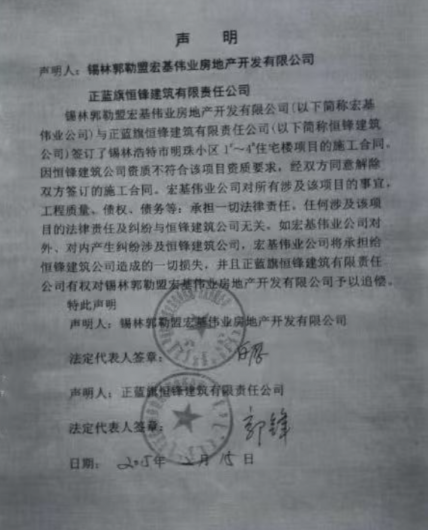 事件回溯:贷款“绕开”开发商 据宏基伟业介绍,2015—2019年间,锡林浩特市晨辉城市基础设施建设投资有限责任公司(下称“晨辉城投”)以“锡市楚办扎斯嘎图社区(明珠小区)棚改项目”名义,分六笔将合计6300万元贷款拨付至正蓝旗恒峰建筑工程有限公司(下称“恒峰建筑”)。宏基伟业称,公司账面从未收到该款项,亦未将其计入项目成本。 2024年,晨辉城投起诉宏基伟业要求归还6300万元及利息。锡林浩特市人民法院作出(2024)内2502民初2008号民事判决,支持了晨辉城投的还款请求。宏基伟业表示,直到诉讼阶段才获悉资金已流向恒峰建筑,且恒峰建筑并非明珠小区实际施工单位。