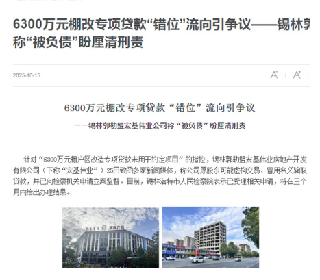 6300万元棚改专项贷款“错位”流向引争议 ——锡林郭勒盟宏基伟业公司称“被负债”盼厘清刑责 针对“6300万元棚户区改造专项贷款未用于约定项目”的指控,锡林郭勒盟宏基伟业房地产开发有限公司(下称“宏基伟业”)25日致函多家新闻媒体,称公司原股东可能虚构交易、冒用名义骗取贷款,并已向检察机关申请立案监督。目前,锡林浩特市人民检察院表示已受理相关申请,将在三个月内给出办理结果。
