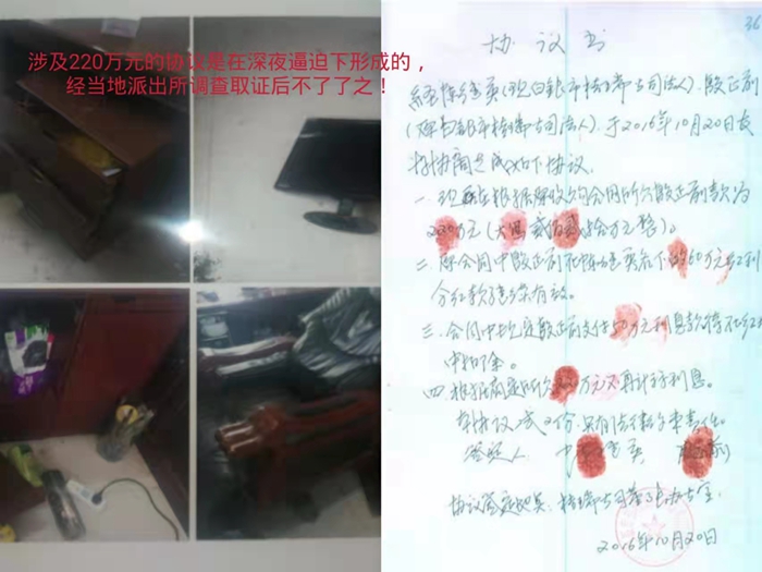 从一开始敲诈“600万元和50万元保护费的欠条”到当天深夜继续恐吓形成的“220万元欠条改成的协议”,对此,当地辖区派出所出警3名干警,曾对白天现场砸坏、砸烂的东西、公司法人陈继英和现场人员罗崇玉的受伤部位分别拍了照、录了像,并对在场人员罗崇玉、徐龙、马得学3人取证做笔录。
