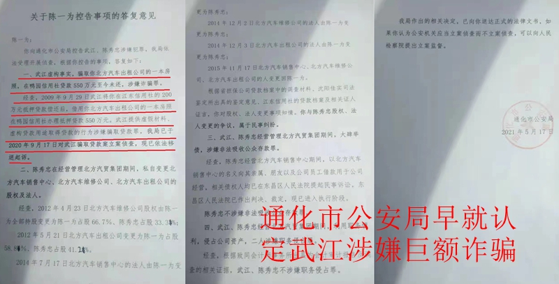 2020年3月,远在深圳的陈一为被召回通化,因北方汽贸的债务纠纷被法院传唤,此时他才得知自己的公司早已被武江、陈秀忠掏空。4月22日,陈一为向通化市公安局东昌分局报案,主张武江涉嫌合同诈骗,却在6月29日收到了《不予立案通知书》,通知书中给出的理由竟然是"未发现犯罪事实"!